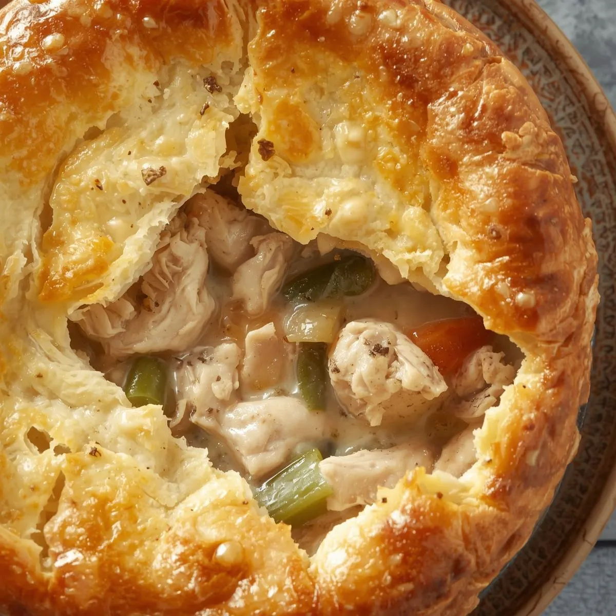 Flaky pastry crust filled with tender chicken, vegetables, and creamy gravy. A classic cozy autumn recipe.
