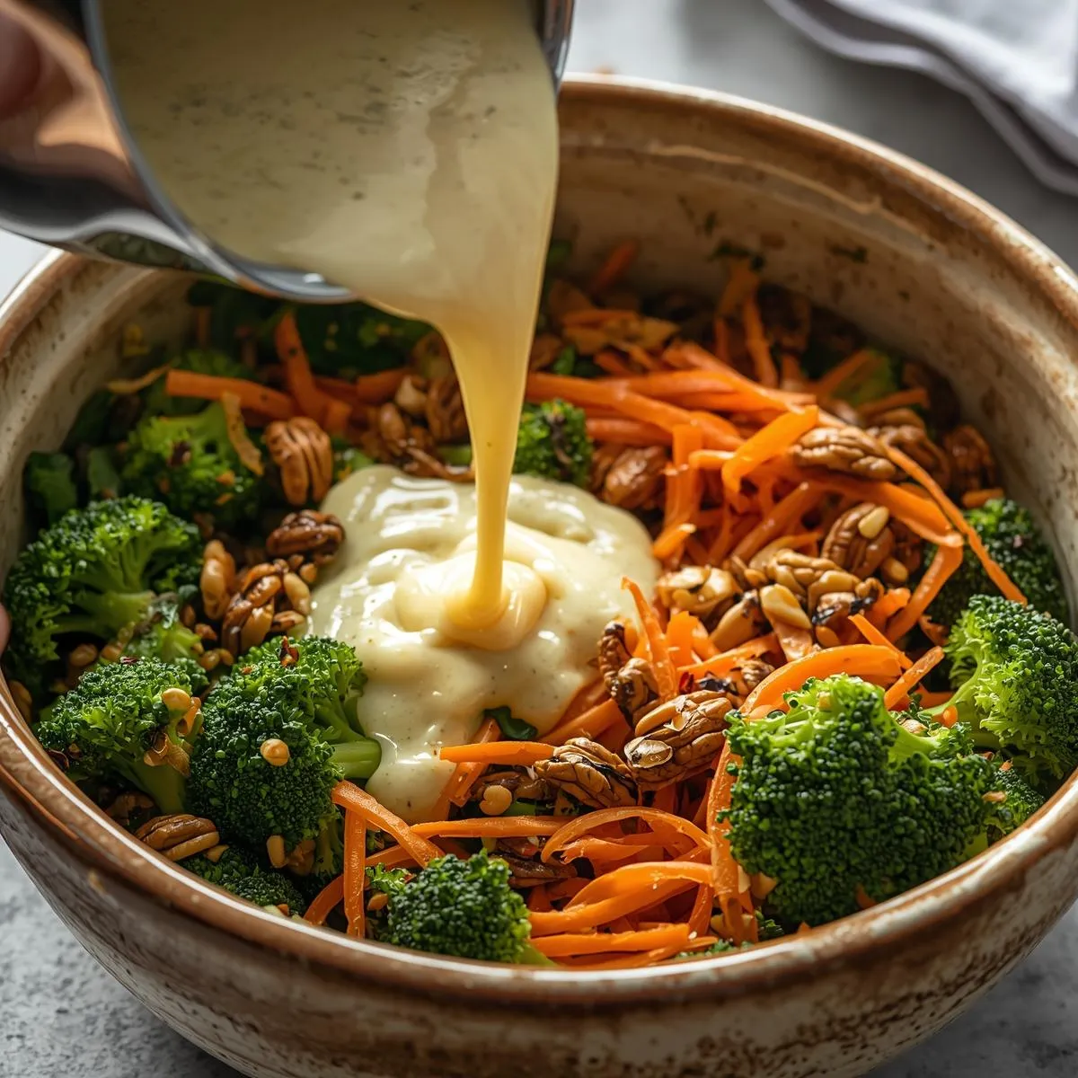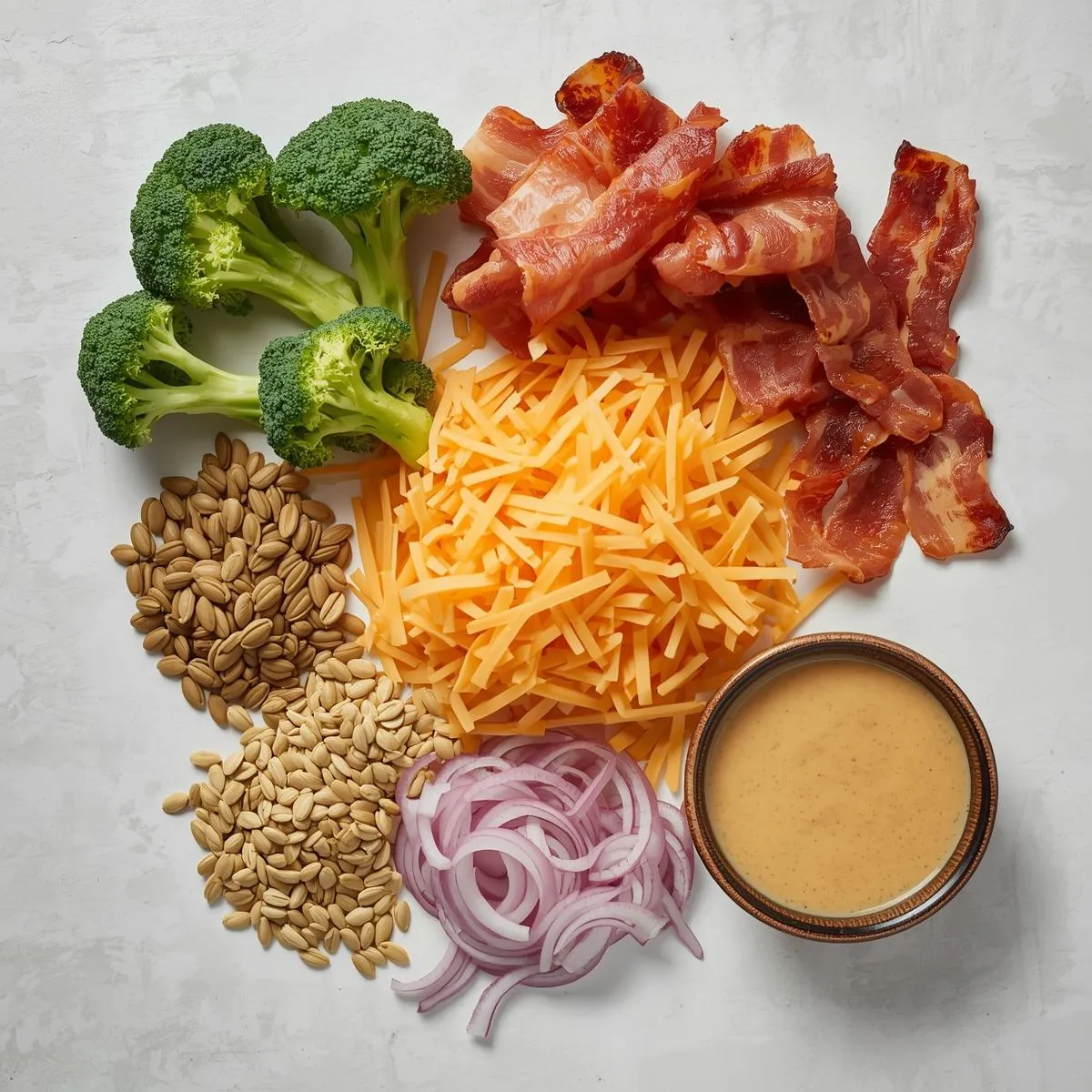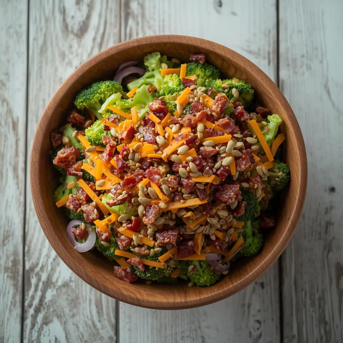 - Assemble – In a large bowl, combine broccoli, bacon, onion, cheese, and sunflower seeds. Pour dressing over the top and toss until evenly coated.