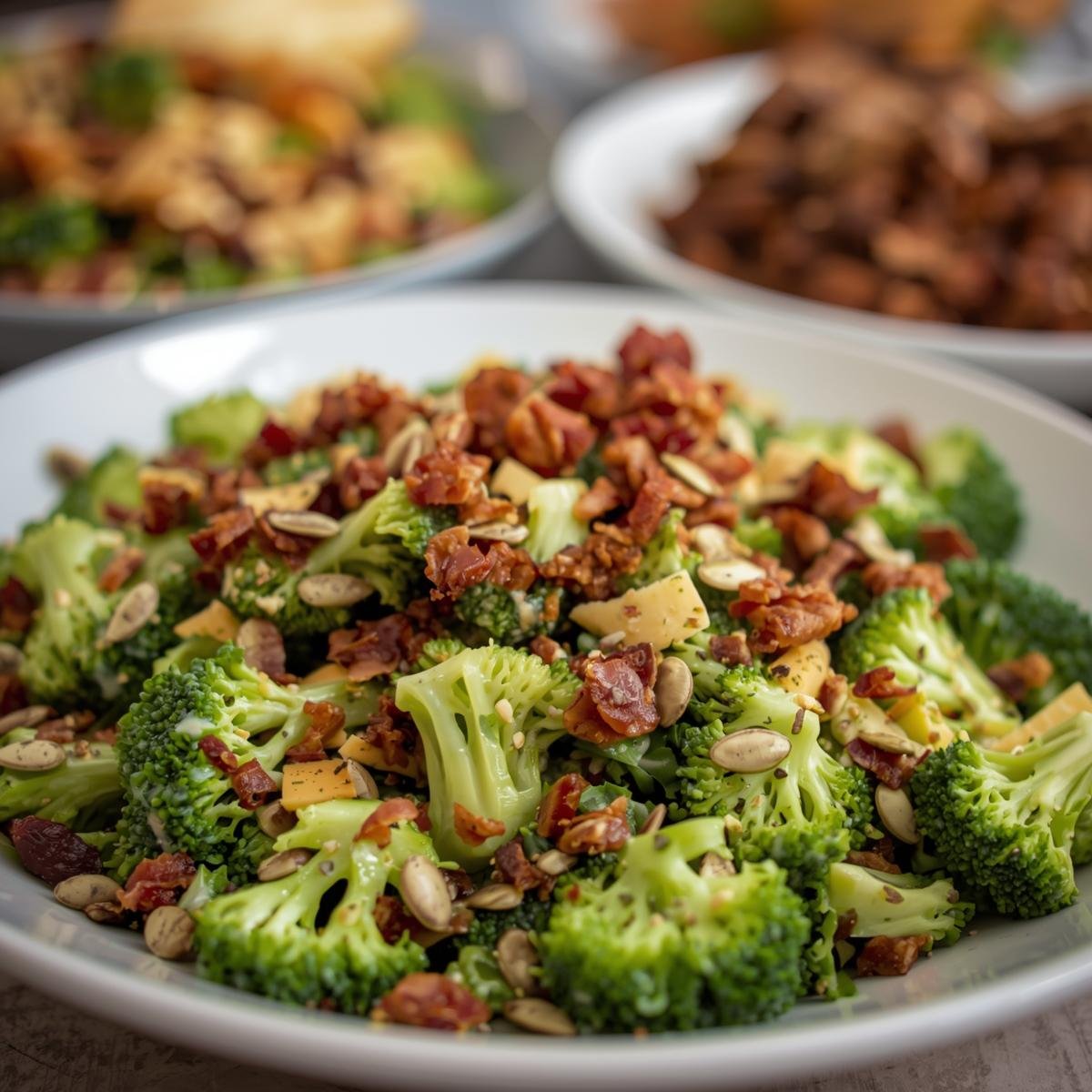 It’s a cold salad made with raw broccoli florets, crispy bacon, cheese, onion, and seeds or nuts, tossed in a creamy mayo-based dressing. The flavors come together to create the perfect balance of sweet, tangy, and savory.
