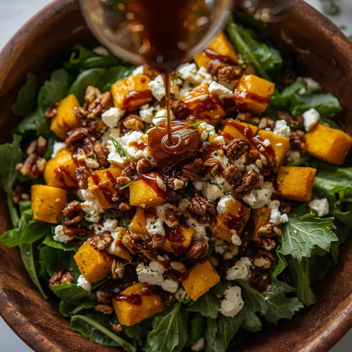 - Assemble salad – Place greens in a large bowl. Add roasted squash, feta, walnuts, cranberries, and pumpkin seeds.