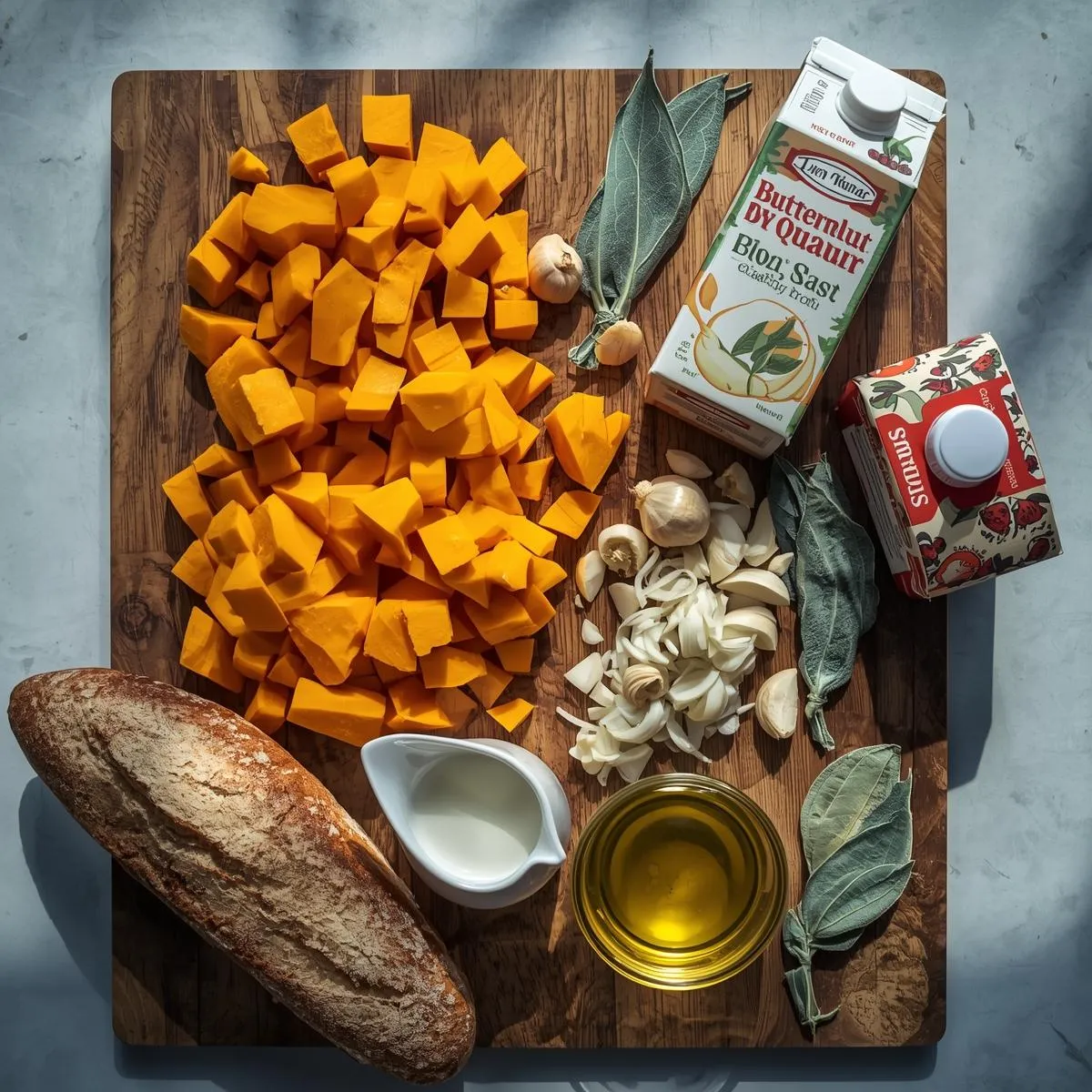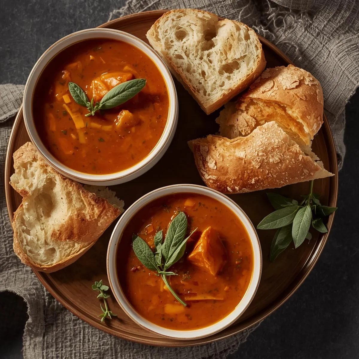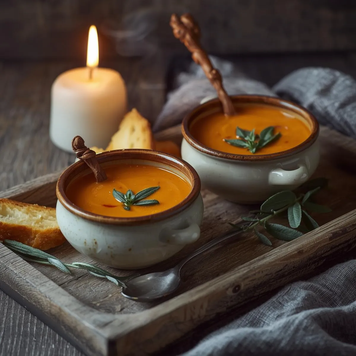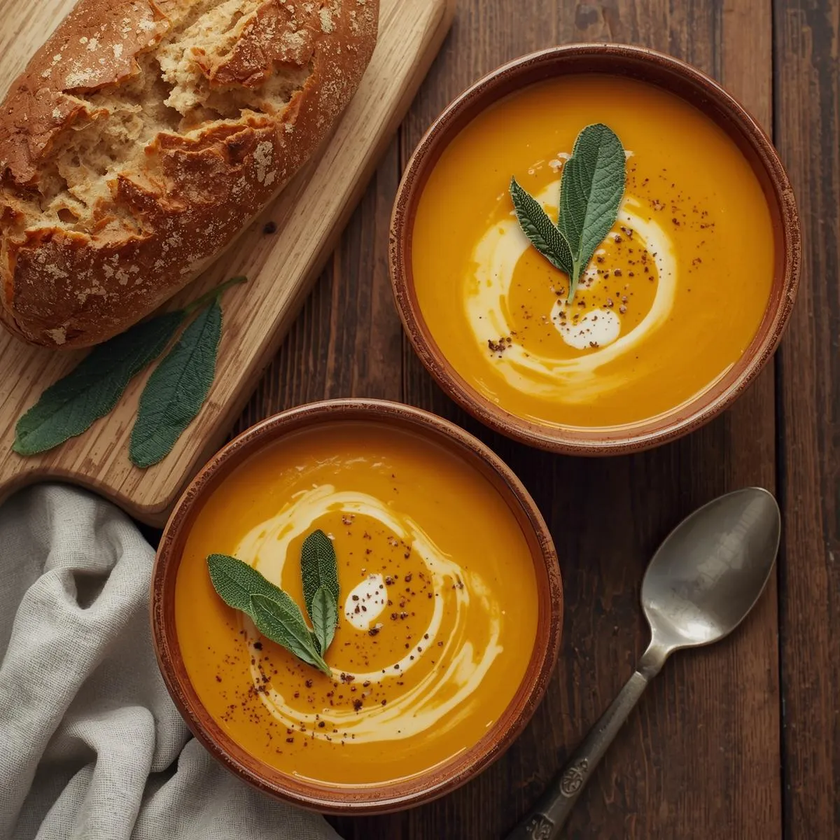 This Butternut-Squash & Sage Soup Served with Crusty Bread for Two is the ultimate cozy meal for fall — creamy, aromatic, and effortlessly romantic. With its silky texture, rich flavor, and fragrant herbs, it’s the kind of simple dish that feels like a warm hug on a cool autumn night. 🍂🥖