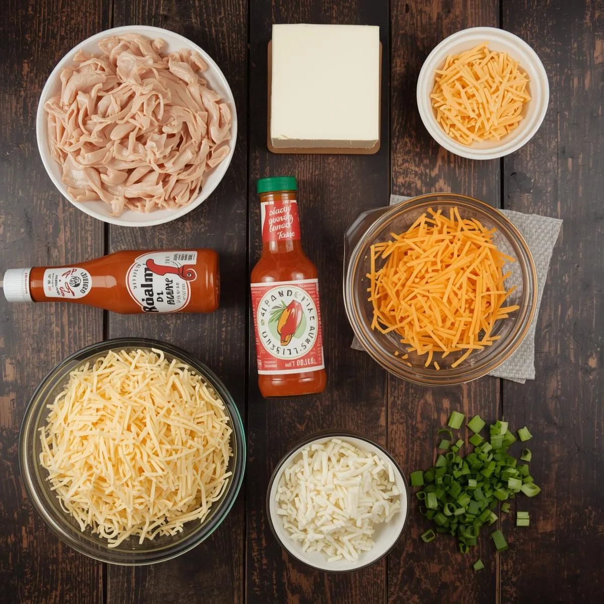 - Add ingredients – Place chicken, cream cheese, ranch dressing, buffalo sauce, cheddar, mozzarella, and garlic powder inside.