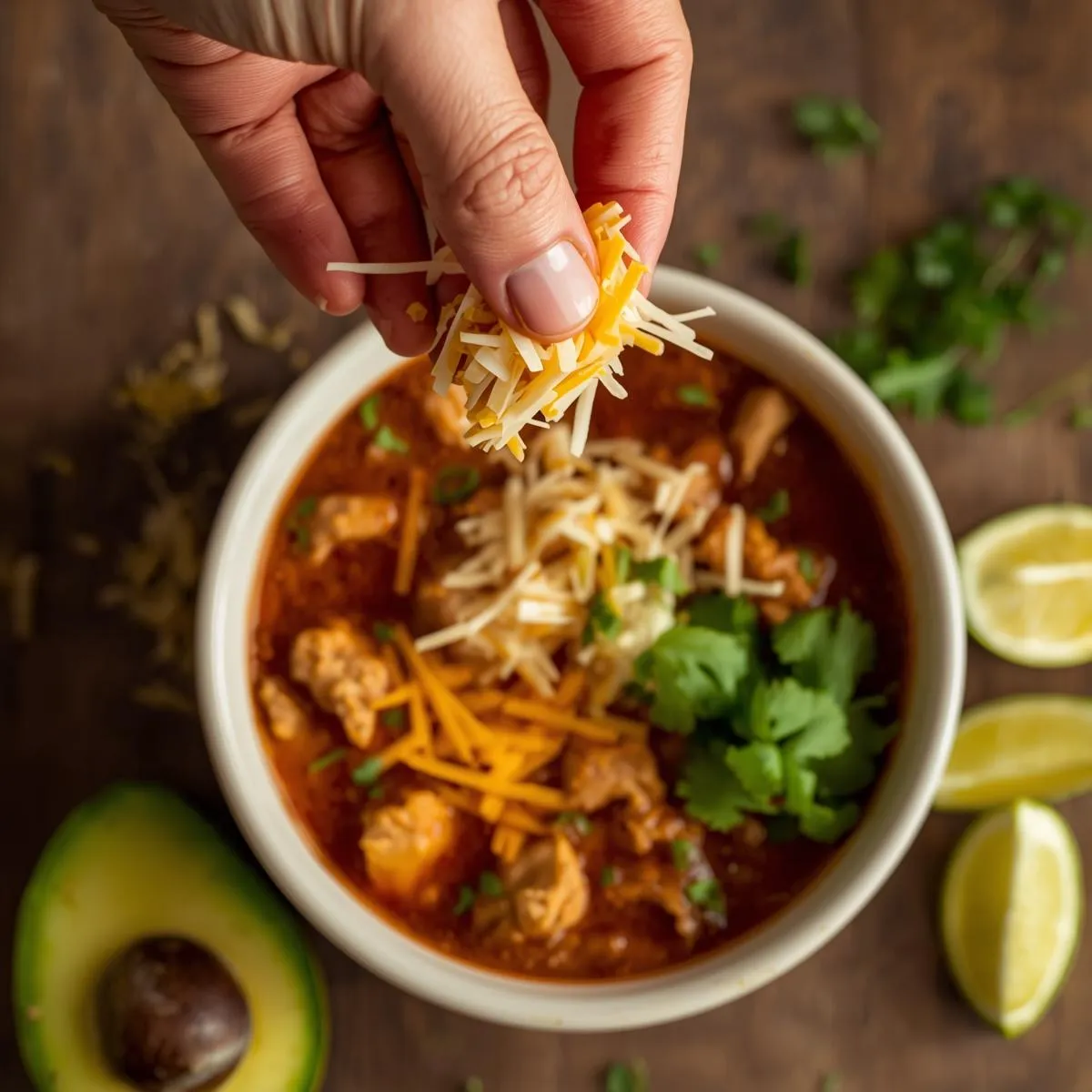 Step 5 – Top It Off: Serve hot with cheese, sour cream, avocado, and tortilla chips.