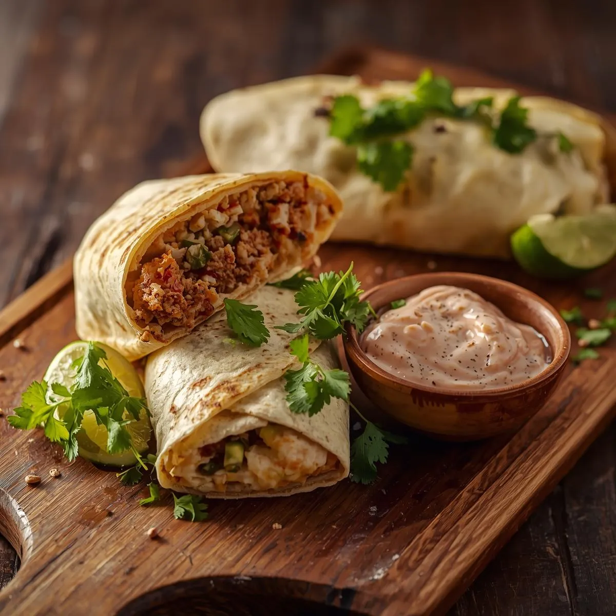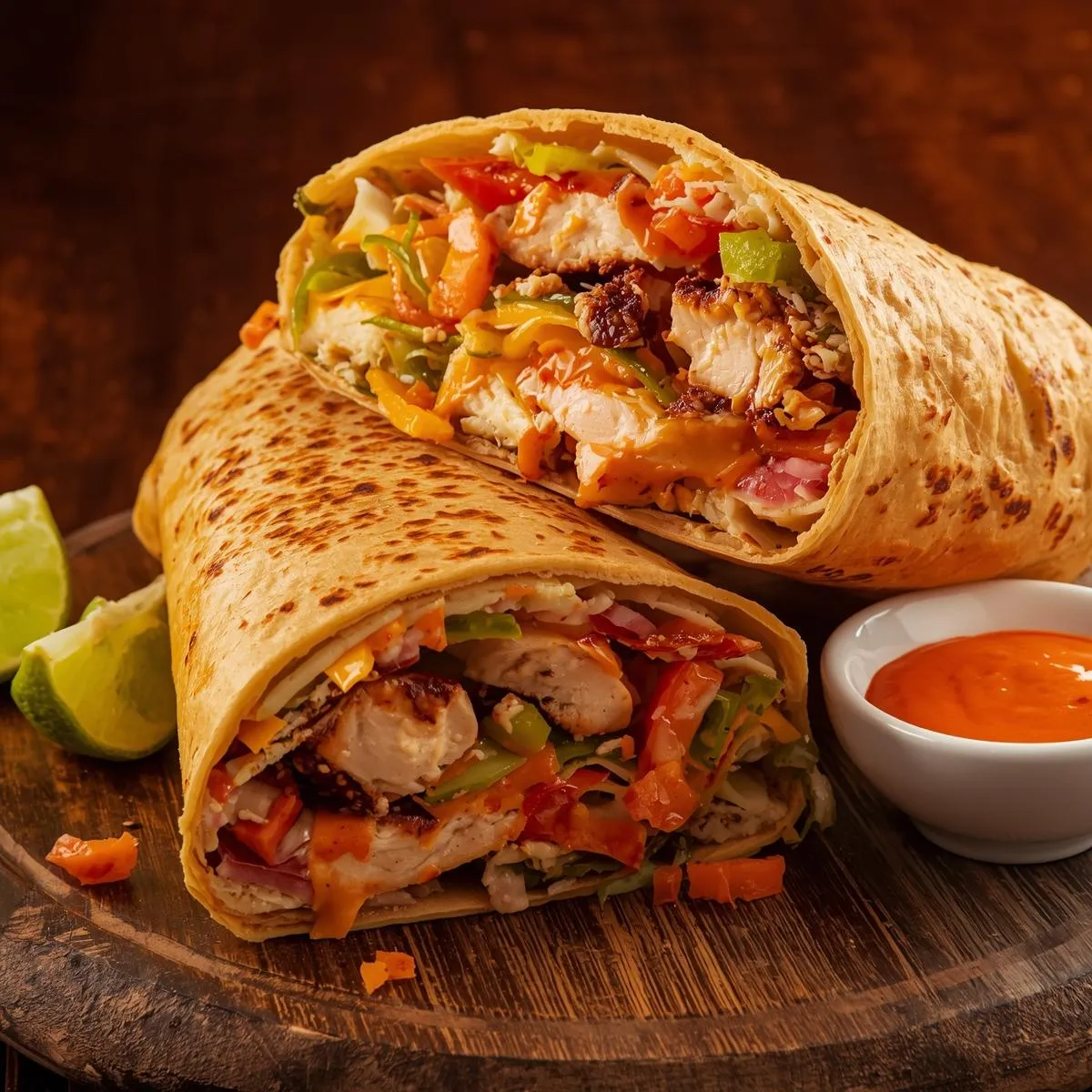 It’s a hearty tortilla wrap stuffed with seasoned grilled chicken, chipotle ranch sauce, and classic burrito fillings like rice, beans, cheese, and veggies. The tortilla is lightly grilled for a golden, crispy outside while staying soft and chewy inside.
