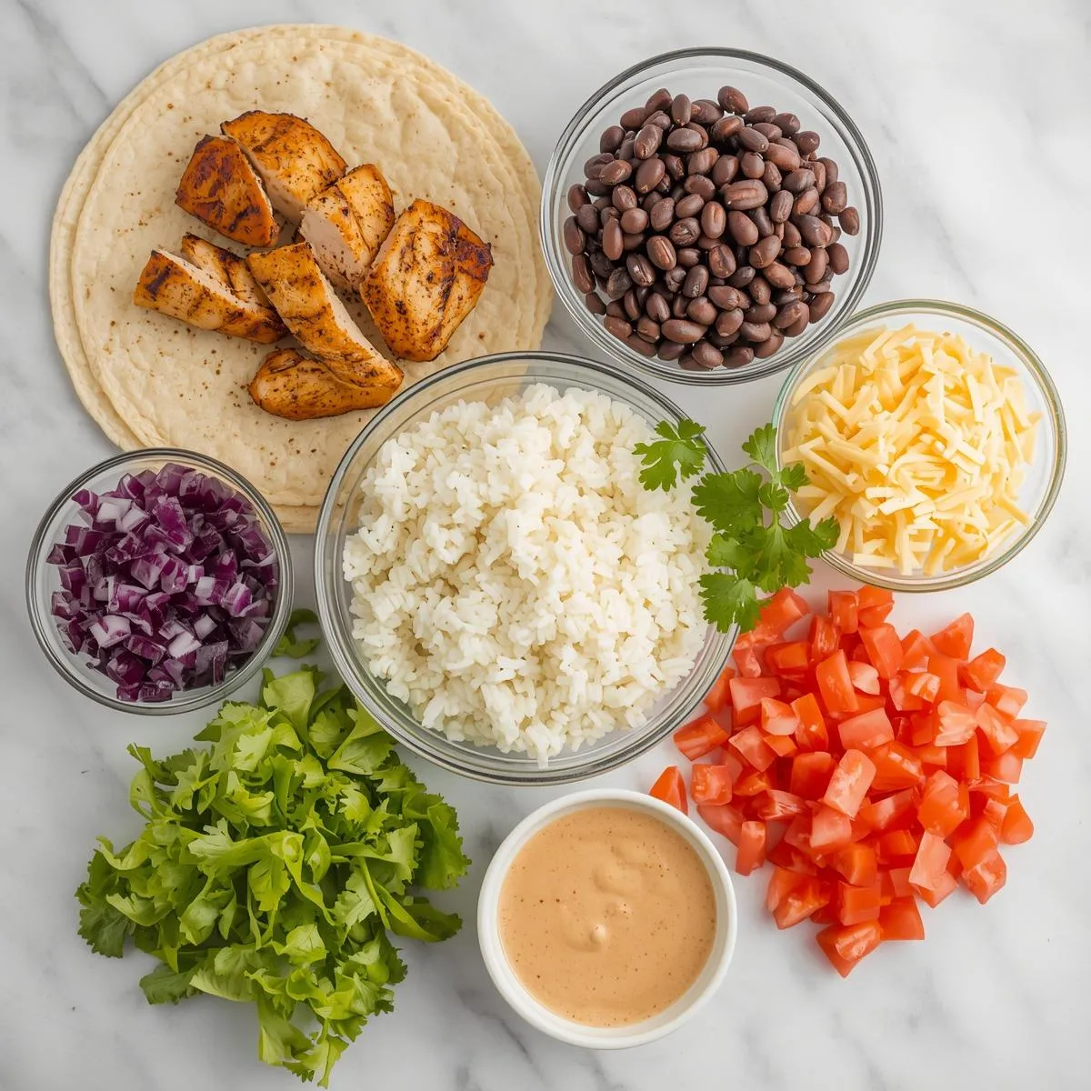 - Assemble burrito – Spread chipotle ranch over each tortilla. Layer with rice, beans, grilled chicken, cheese, lettuce, tomatoes, and onion.