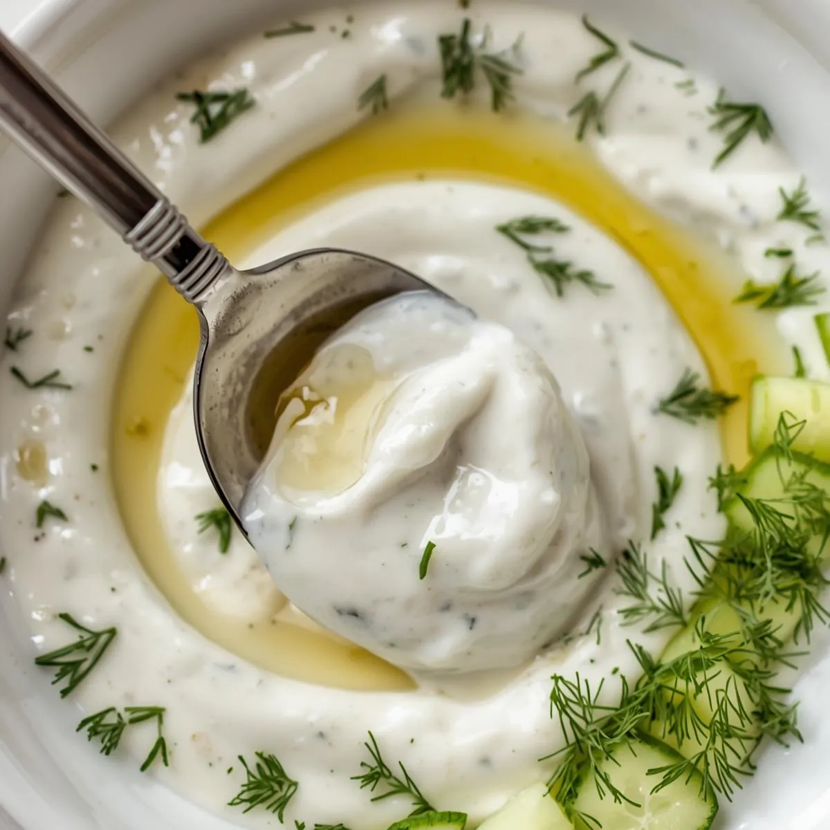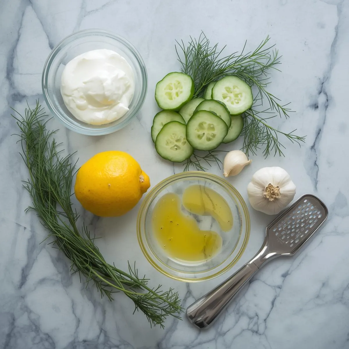- Mix it up: In a medium bowl, combine Greek yogurt, minced garlic, olive oil, lemon juice, and dill.