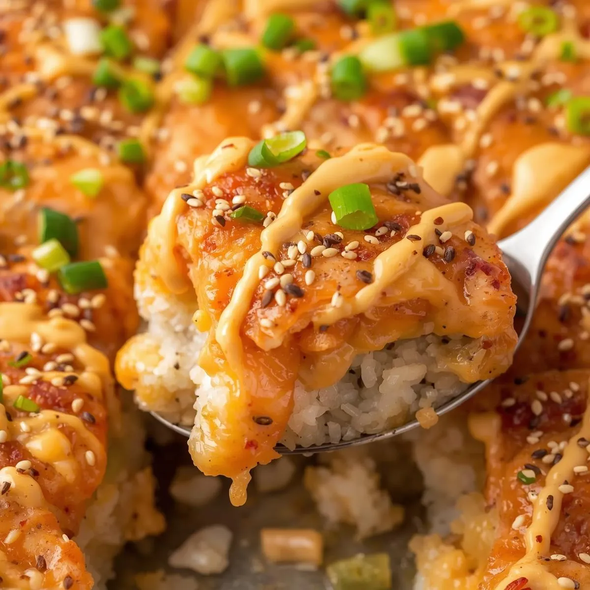 Spread the salmon mixture over the rice. Drizzle extra spicy mayo on top and sprinkle with furikake. Bake at 400°F (200°C) for 10–12 minutes, or until warm and slightly golden.