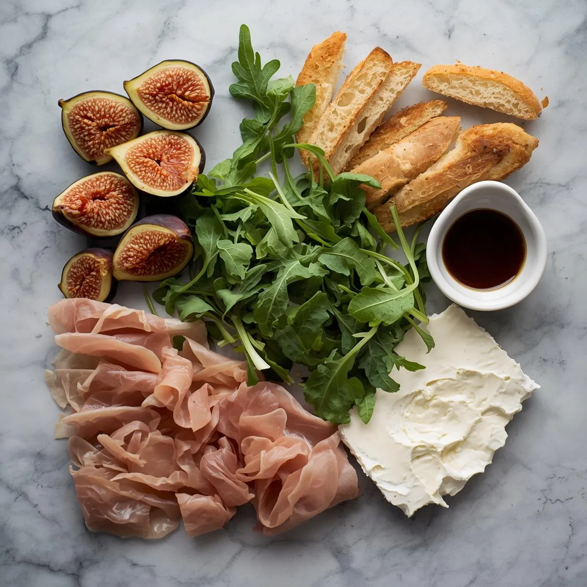 Spread a layer of goat cheese (or your chosen base) on each toasted slice. Top with a slice or two of fig, a few ribbons of prosciutto, and a small handful of arugula.
