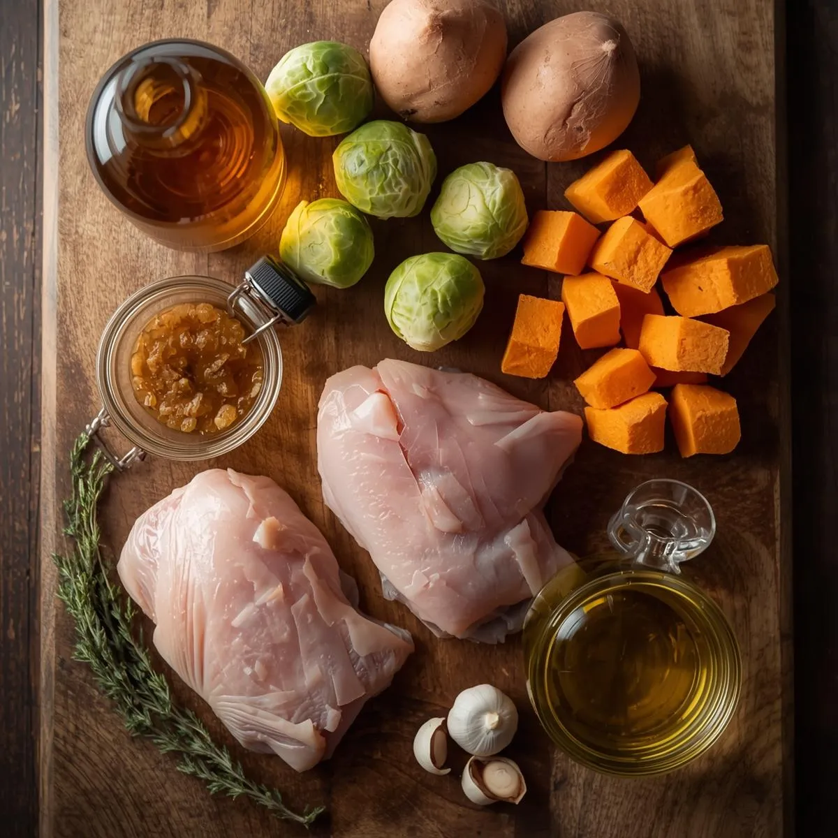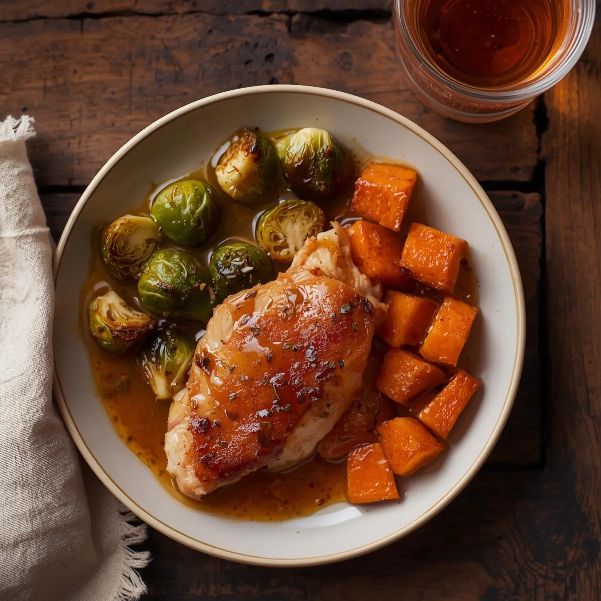 Return the chicken to the skillet and spoon the glaze over the top to coat. Plate with roasted Brussels sprouts and sweet potatoes, then drizzle extra reduction over the chicken before serving.