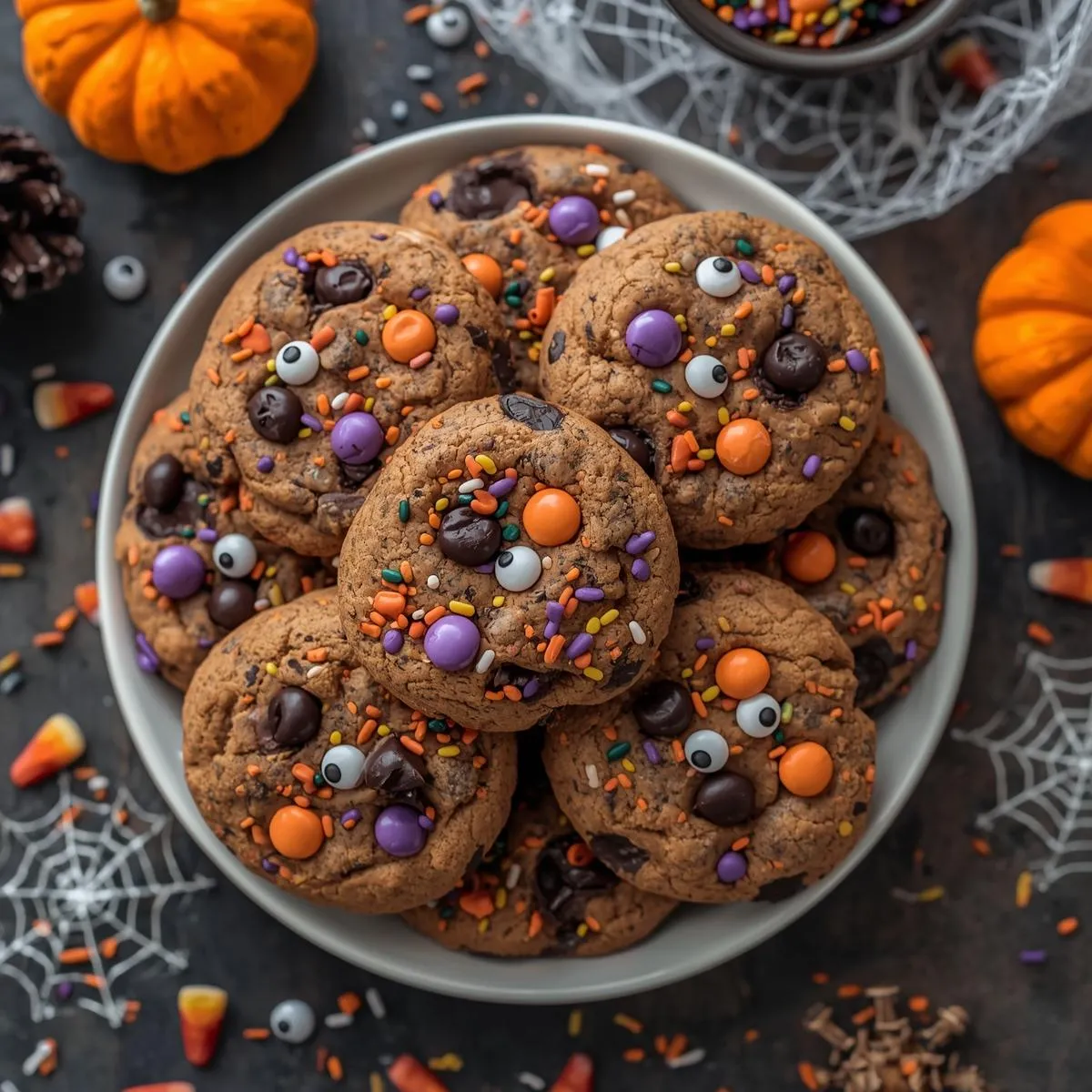 These are chewy chocolate chip cookies baked with festive add-ins like orange and purple M&Ms, Halloween sprinkles, and candy eyes. They’re the same buttery, rich cookies you love, but with a seasonal makeover that makes them perfect for October celebrations.