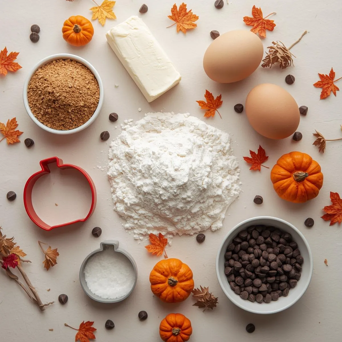 - Make cookie dough – In a bowl, whisk flour, baking powder, salt, and pumpkin pie spice. In another bowl, beat butter and sugar until creamy. Add egg and vanilla. Slowly mix in dry ingredients until dough forms.