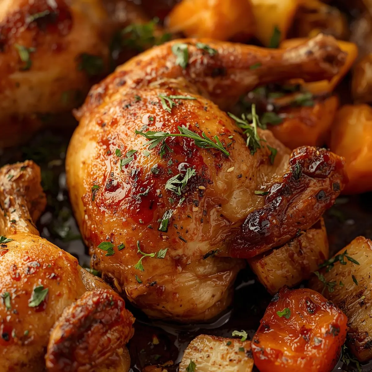 Step 4 – Roast: Arrange chicken skin-side up on top of the vegetables. Roast for 35–40 minutes, or until chicken reaches 165°F and vegetables are tender and caramelized.