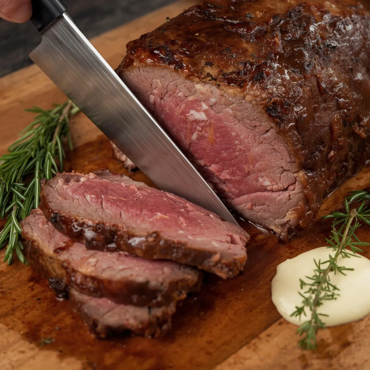Slice the prime rib into thick, tender pieces and serve with a generous spoonful of horseradish cream.