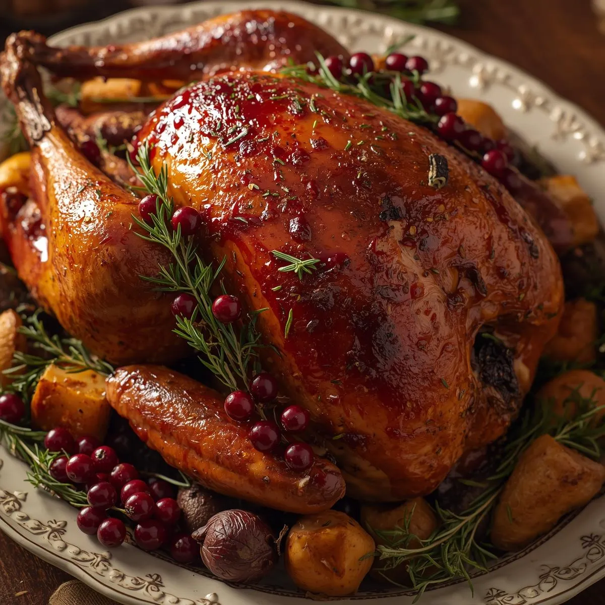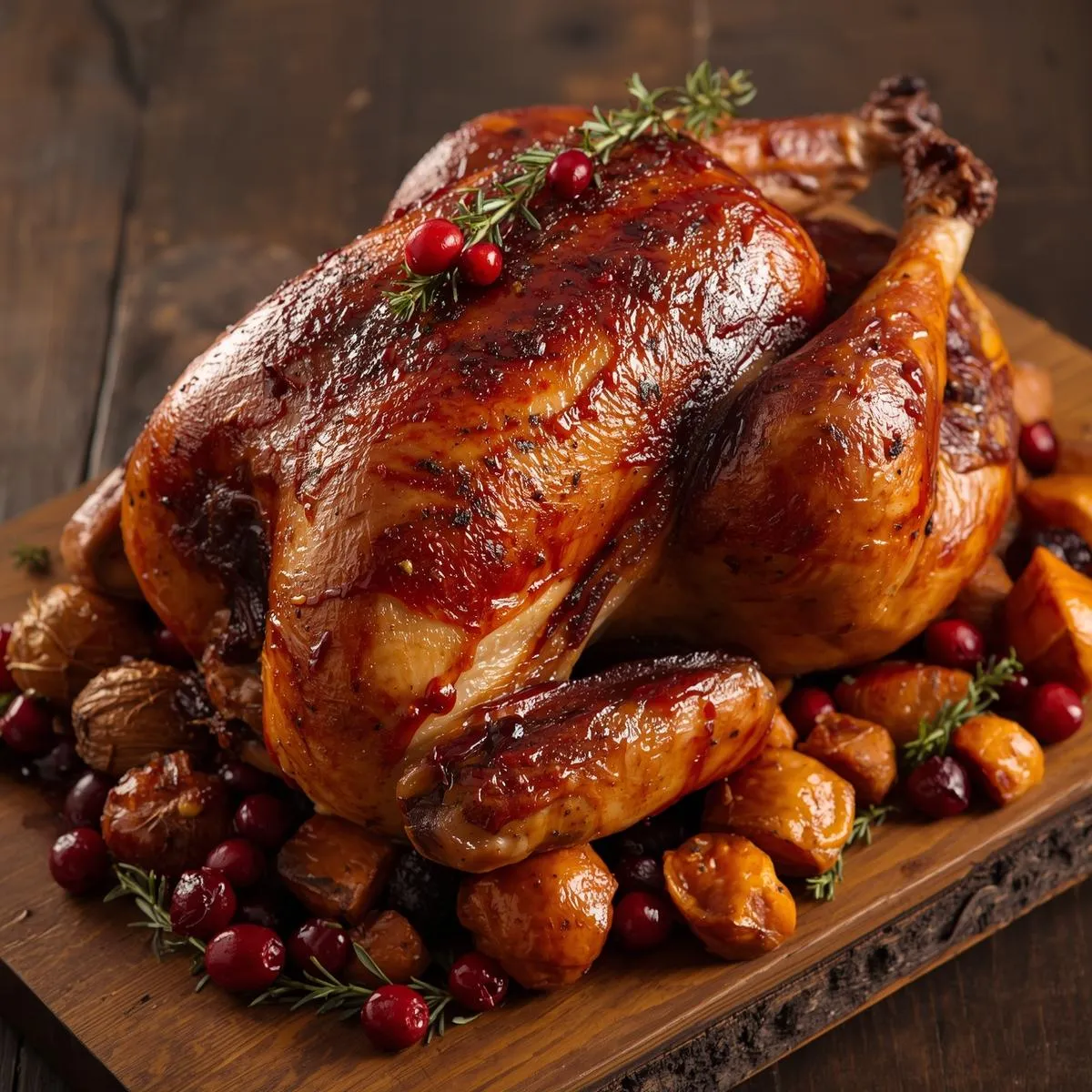 Preheat oven to 325°F (160°C). Place turkey breast-side up on a roasting rack. Roast for 2.5–3 hours (about 13 minutes per pound), basting occasionally with cranberry-thyme glaze during the last hour.