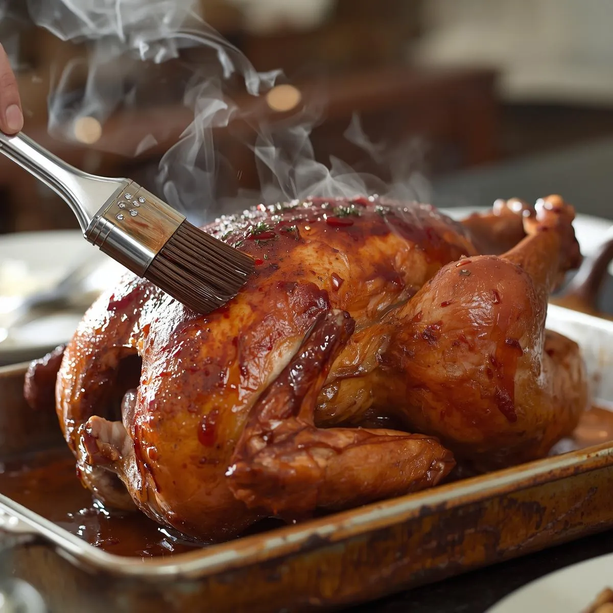 Brushing with butter or glaze and allowing it to rest after roasting ensures juicy meat.