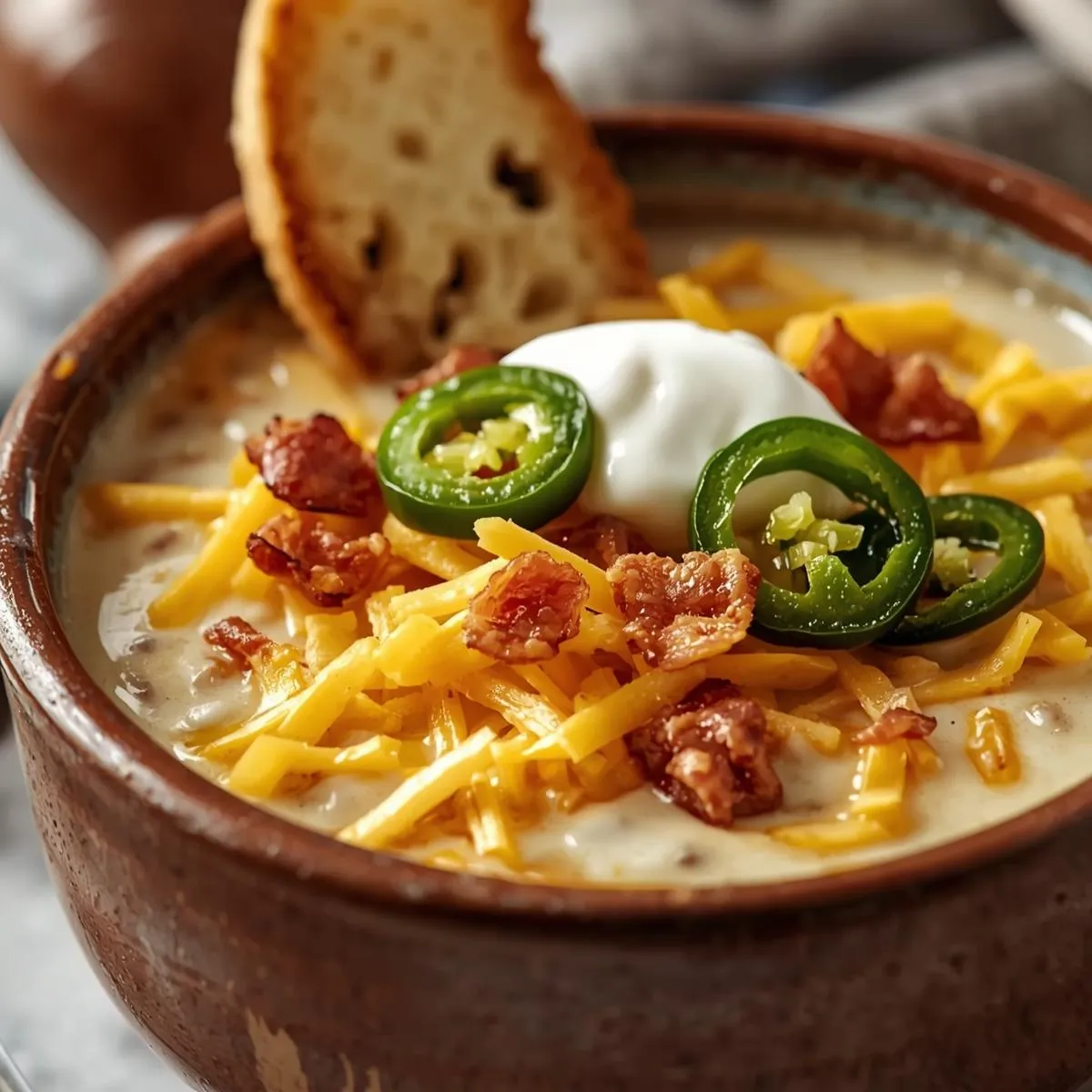 - Serve – Ladle into bowls and top with bacon, cheese, jalapeños, and sour cream.