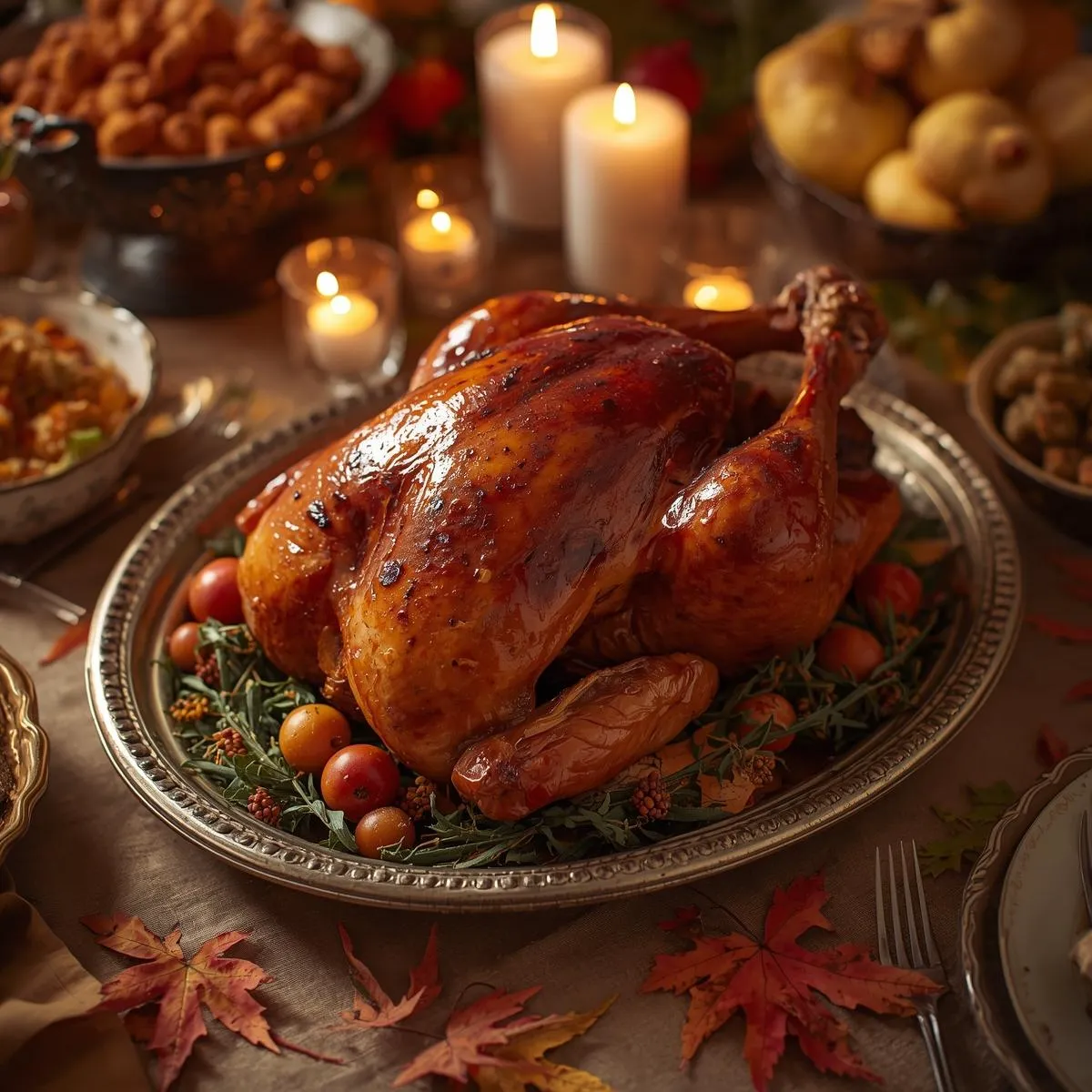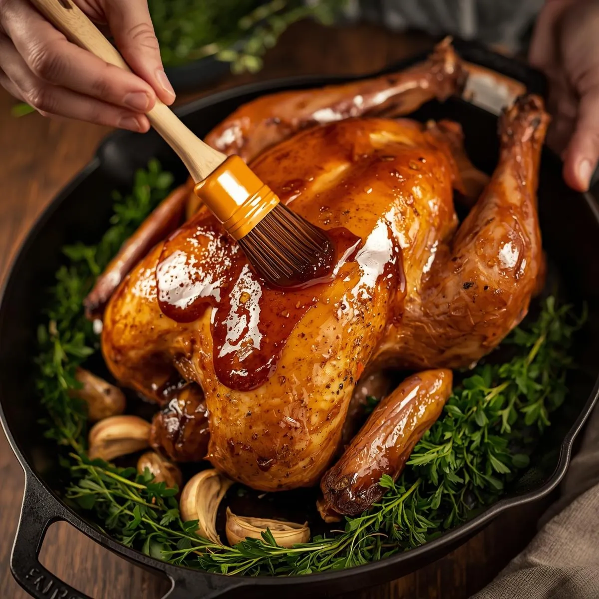 In the last 20 minutes of roasting, brush the turkey generously with the maple-butter glaze. Let it caramelize to a golden, glossy finish.