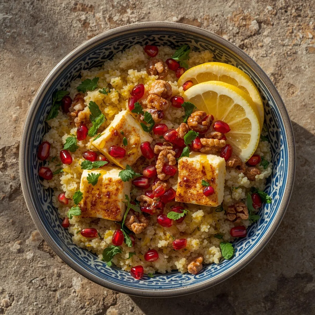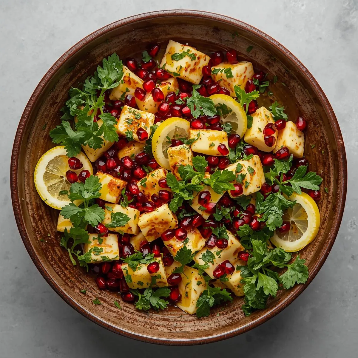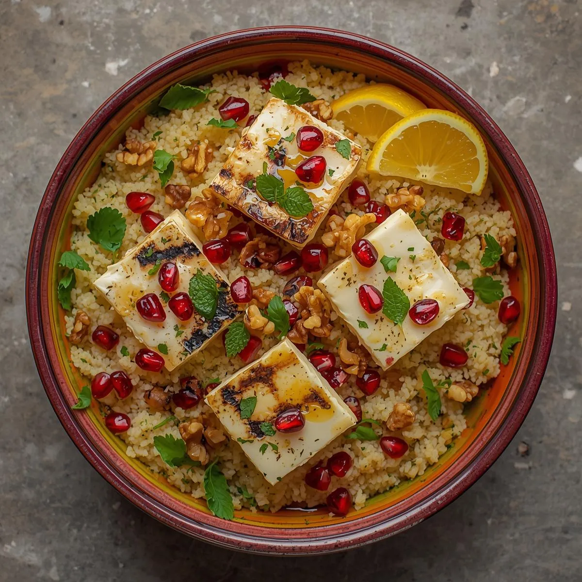 🧀 Salty-Sweet Harmony: Halloumi, pomegranate, and walnuts create perfect balance.