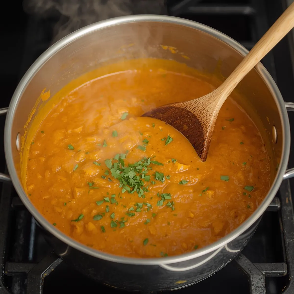 Step 3 – Add Pumpkin & Tomatoes: Mix in pumpkin puree and diced tomatoes, stirring to combine.