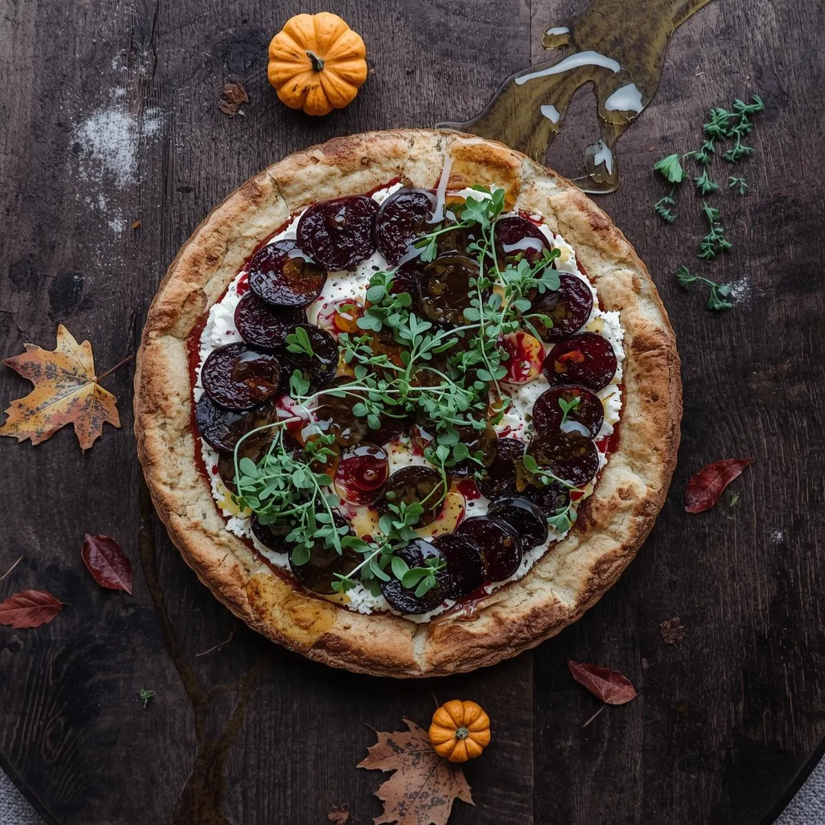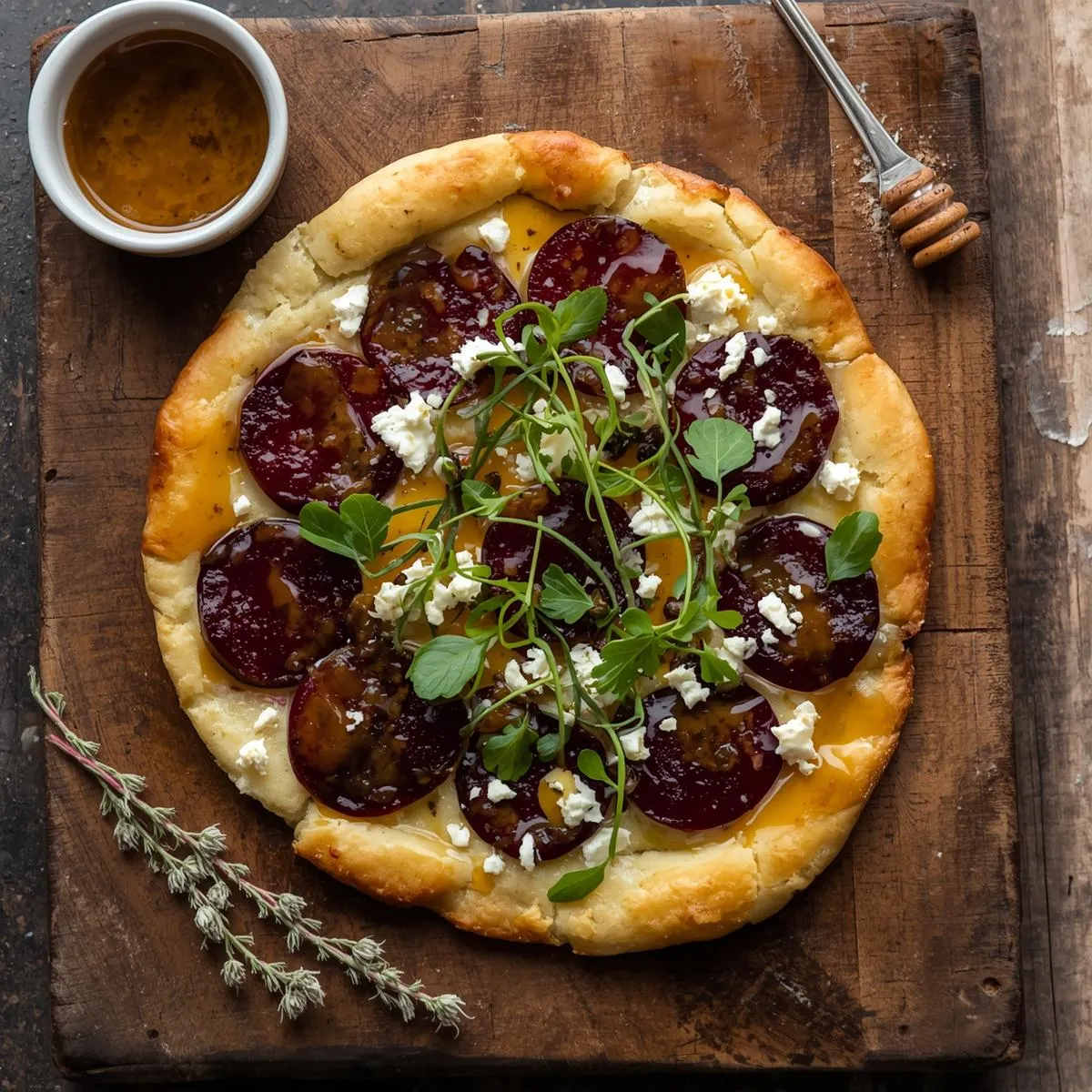 Roasted Beet-and-Feta Tart with Honey Drizzle and Microgreens