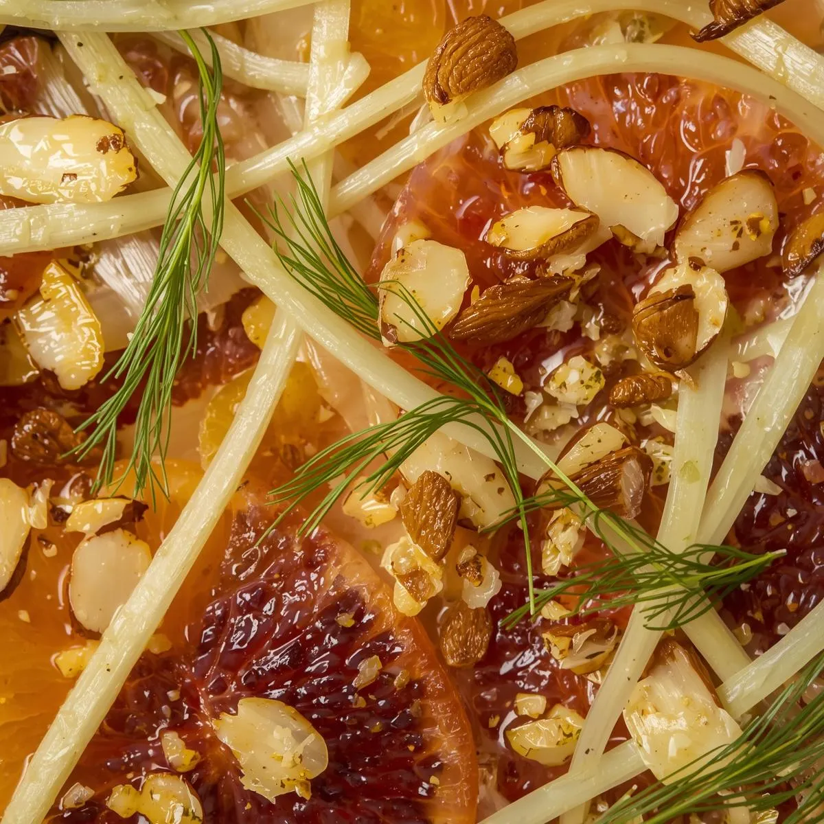Spread the fennel on a plate, layer the citrus segments, sprinkle almonds on top, and finish with fennel fronds and a drizzle of dressing.