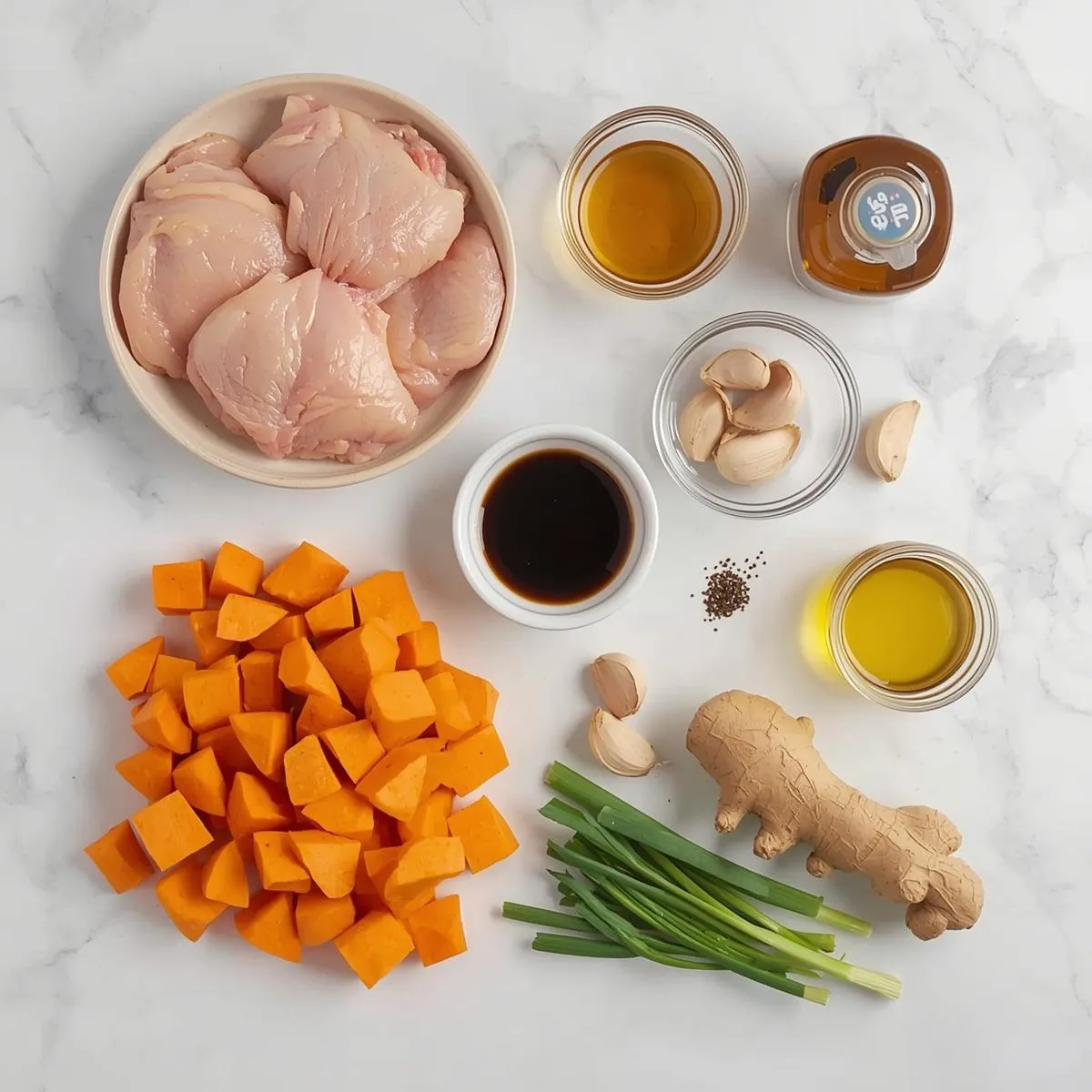Step 4 – Prepare the Pan: Spread cubed sweet potatoes on the baking sheet. Drizzle with olive oil, salt, and pepper. Arrange the marinated chicken thighs on top.