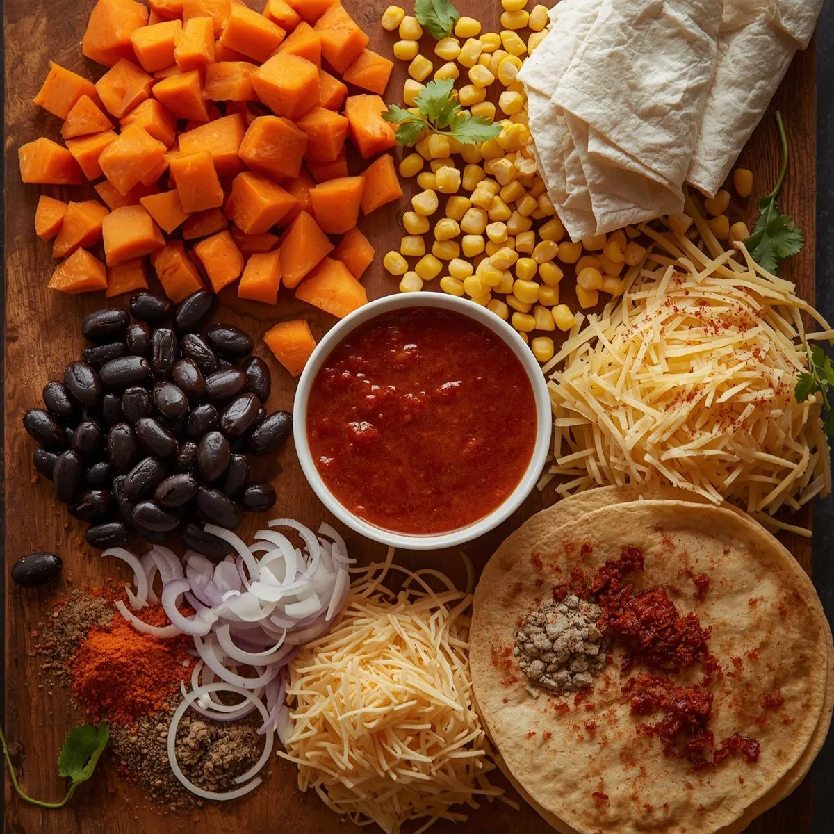 Step 2 – Prepare the Filling: In a skillet, heat a little olive oil and sauté onion and garlic until fragrant. Stir in roasted sweet potatoes, black beans, and corn. Mix well and season to taste.