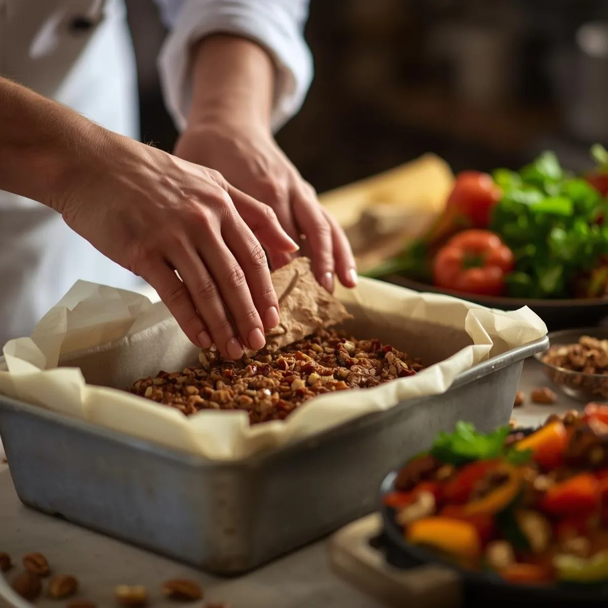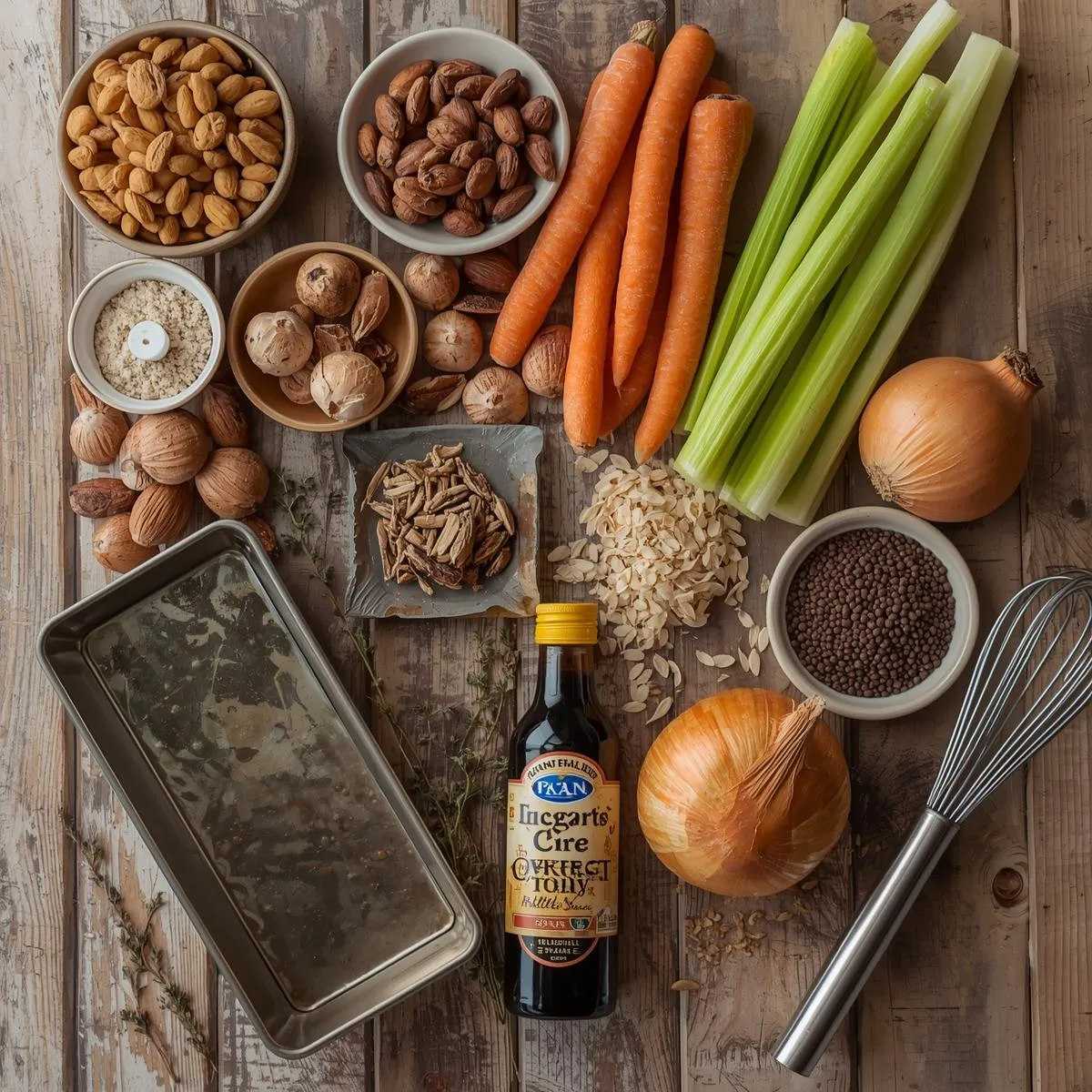 Preheat oven to 375°F (190°C). Heat olive oil in a skillet, sauté onion, carrot, celery, and garlic until soft. Add herbs, soy sauce, lentils, and nuts. Mix well, then stir in flax egg and breadcrumbs until combined.